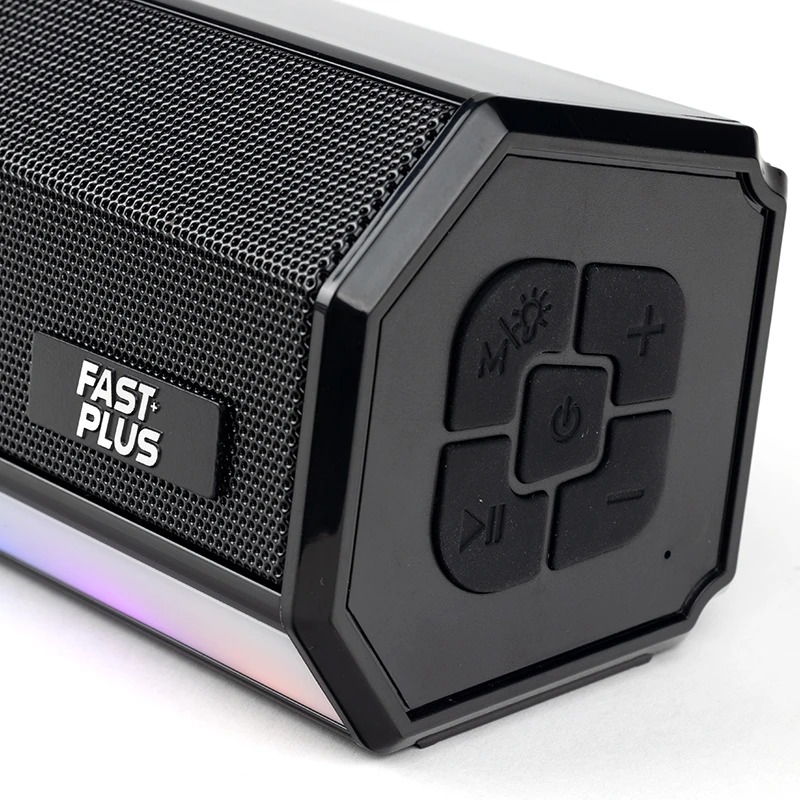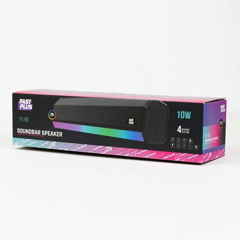 اسپیکر ساندبار فست پلاس FS-80 با 2 عدد بلندگوی 10 واتی نهفته در ابعاد جمع و جور، توانایی بر طرف کردن بخش عظیمی از نیازهای کاربران را دارا است. جنس به کار رفته در ساندبار فست پلاس FS-80، پلاستیک بوده، تا در کنار ابعاد کوچک، سبک بودن را چاشنی آن کند تا در جا به جا کردن این ساندبار مشکلی به وجود نیاید. وجود حالتهای گوناگون نورپردازی RGB در کنار جلوه صوتی ارتقاء یافته، ساندبار فست پلاس FS-80 را هم در زیبایی و هم در کیفیت مؤثر میسازد. نورپردازی RGB این اسپیکر به صورت یک نوار سراسری در قسمت پایینی آن قرار گرفته که زیبایی خاصی به این محصول بخشیده که می توانید در کنار صدای باکیفیت از این قابلیت هم لذت ببرید. این امکان وجود دارد تا ساندبار فست پلاس FS-80 به سادگی در زیر هر دستگاهی که شما دارید پنهان و یا پوشیده شود. این امر از آنجا نشأت میگیرد که ساندبار فست پلاس FS-80 ابعادی در حدود تنها 30 سانتی متری را به خود اختصاص میدهد. این ابعاد جمع و جور، میتواند کاملاً برای سیستم صوتی شما مناسب باشد. دکمه های روشن و خاموش کردن و زیاد و کم کردن صدا و همچنین تنظیم RGB و تغییر مود دستگاه در کنار این اسپیکر قرار گرفته است. ساندبار فست پلاس FS-80 با اتصال بلوتوث 5.3 به راحتی و در سریع ترین زمان به دستگاه شما متصل می شود. این ساندبار به پشتوانه همراه شدن با کابل صوتی 3.5 میلیمتری و USB، این اجازه را میدهد تا همانند یک مهمانی بزرگ، انواع وسیعی از صحنههای اجرای موسیقی را در کامپیوتر شخصی، تلویزیون، لپتاپ و یا تلفن همراه هوشمند خود شبیهسازی کنید. در تمامی این موارد ذکر شده میتوانید ساندبار را به خوبی بر روی دستگاه خود متصل کنید و به مهمانی خود هیجان و جذابیت بیشتری را ببخشید.