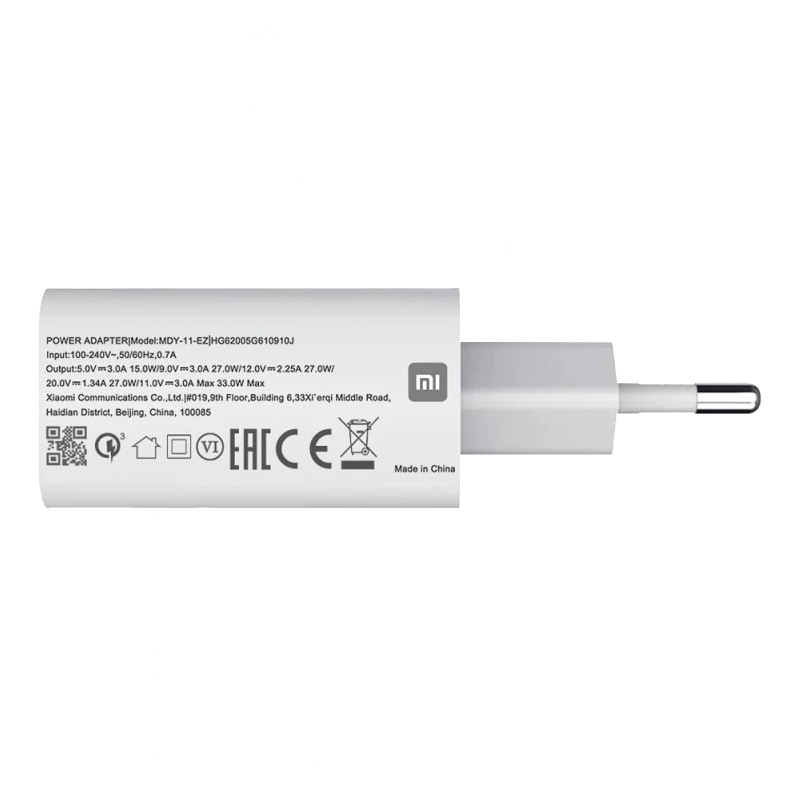 شارژر شیائومی از بدنه ای محکم به جنس پلاستیک ABS و پلی کربنات ضد حرارت ساخته شده که از مقاومت بالایی در برابر ضربه، فشار، حرارت دمای بالا و … برخوردار است. بر روی این آداپتور یک پورت خروجی USB تعبیه شده که با حداکثر شدت جریان خروجی ۳ آمپر و ولتاژ خروجی متغیر بین ۵، ۹، ۱۲ ، ۲۰ و ۱۱ ولت توانایی شارژ دستگاه های سازگار با سرعت بالا را دارد. این کلگی با پشتیبانی از فناوری شارژ سریع QC3.0 قادر است با توان خروجی ۳۳ وات، گوشی موبایل و دیگر گجت ها را بسیار با سرعت و در کوتاهترین زمان ممکن شارژ کند. این محصول به تکنولوژی Power Delivery مجهز است که با ایجاد جریانی پایدار متناسب با توان دستگاه، عملیات شارژ ایمن را انجام می دهد و از آسیب به باتری در حال شارژ در برابر نوسانات ولتاژ و جریانی، اتصالات کوتاه و افزایش دما محافظت می نماید. همچنین همراه کلگی فست شارژ شیائومی MDY-11-EY، یک کابل تایپ سی با جنس مرغوب و مقاوم به همراه جعبه گوشی نیز ارائه می شود.