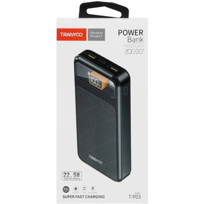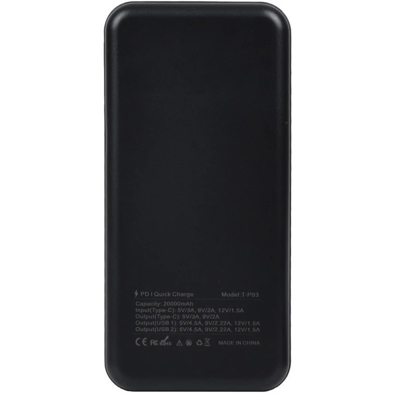 ظرفیت: ۲۰۰۰۰ میلی آمپر پورت ورودی: یک پورت تایپ سی پورت خروجی: دو پورت USB و یک پورت تایپ سی (به صورت مشترک) دارای نمایشگر دیجیتال برای نمایش میزان شارژ باطری وزن: ۳۶۶گرم عرض: ۷cm ، طول: ۱۴.۵cm ، ضخامت: ۲.۷cm جنس بدنه: ABS ضد اشتعال و باتری لیتیومی همراه با کابل پاوربانکی USB/TC سازگاری با تمامی دستگاه ها