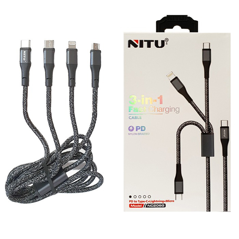 کابل چند سر نیتو با مدل NC206B که دارای خروجی های شارژ میکرو ، تایپسی و لایتنینگ بوده و دارای یک روکش کنفی برای مقاومت بیشتر این کابل در برابر کشش و پوسیدگی است و از تولیدات برند محبوب Nitu نیز میباشد. از ویژگی جالب توجه و خوب این کابل Nitu NC206C دارا بودن قابلیت فست شارژ میباشد که میتوانید دستگاه های موبایل خود را که از شارژ سریع پشتیبانی میکنند توسط این کابل شارژ نمایید.